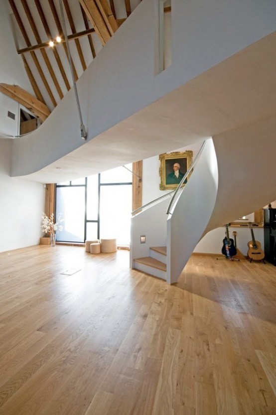 Sometimes it's amazing how a team of designers and architects can change a space. Stedman Blower Architects reconstruction of an old farm in Surrey, England, and has created a fantastic modern and comfortable. The main challenge was briefly outside has remained relatively unchanged. Upon entering, the transformation is amazing. A large central void (eight meters high and a half!) Sets the tone for the entire design, characterized by openness and space. Incredible wooden beams, white walls and modern furniture, different colors - that's what gives success to him! The interior is fairly quiet, full of light. Wood is everywhere and the old ceiling beams remained for owners to remember where you live and what this place was before the changes. Is not it amazing conversion, guys?